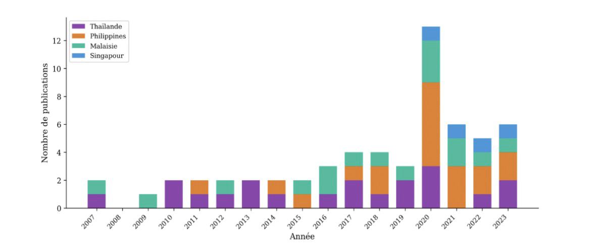 Le corpus total comprend 135 publications : 76 pour la Caraïbe insulaire et 59 pour l’Asie du Sud-Est. Dans la Caraïbe, Porto Rico domine la production (47 %), suivi d’Haïti (21 %), de Trinité-et-Tobago (18 %) et de la Barbade (13 %). En Asie du Sud-Est, la Thaïlande arrive en tête (34 %), suivie des Philippines (32 %), de la Malaisie (27 %) et de Singapour (7 %). L’analyse temporelle révèle une croissance irrégulière mais convergente : 80 % des publications caribéennes et 93 % des publications asiatiques sont concentrées entre 2011 et 2023 (Figures 1 et 2). L’année 2018 marque un pic pour la Caraïbe (9 publications) et l’année 2021 pour l’Asie (13 publications), cette dernière coïncidant avec le passage de typhons dévastateurs dans la région.