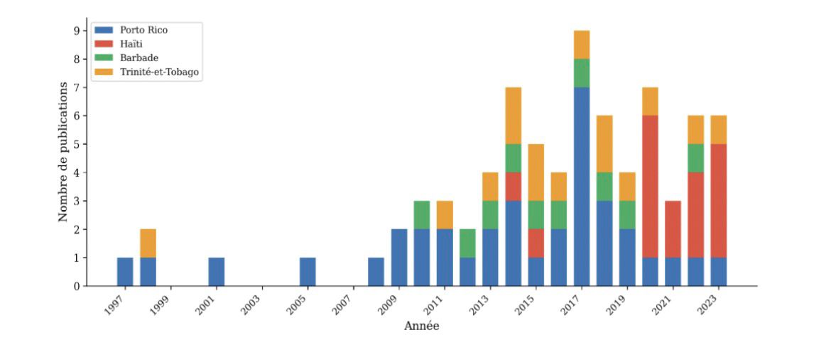 Enfin, le faible taux de libre accès (37–47 %) et la quasi-exclusivité de l’anglais (99 %) limitent la diffusion des connaissances auprès des décideurs et des populations locales, en particulier dans les territoires francophones et créolophones comme Haïti. Cette situation va à l’encontre des principes de la science ouverte et appelle des politiques volontaristes de diffusion multilingue.