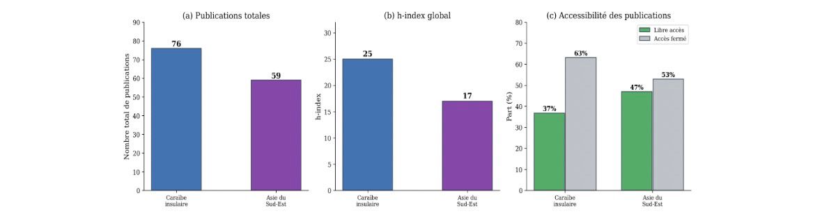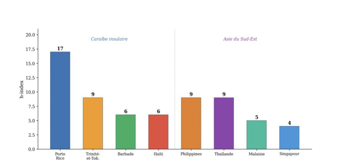 La Caraïbe affiche un h-index global de 25 contre 17 pour l’Asie du Sud-Est (Figure 5). À l’échelle des territoires, Porto Rico (h = 17) domine la Caraïbe, tandis que les Philippines et la Thaïlande (h = 9 chacun) mènent en Asie. Le tableau 2 synthétise l’ensemble des indicateurs.