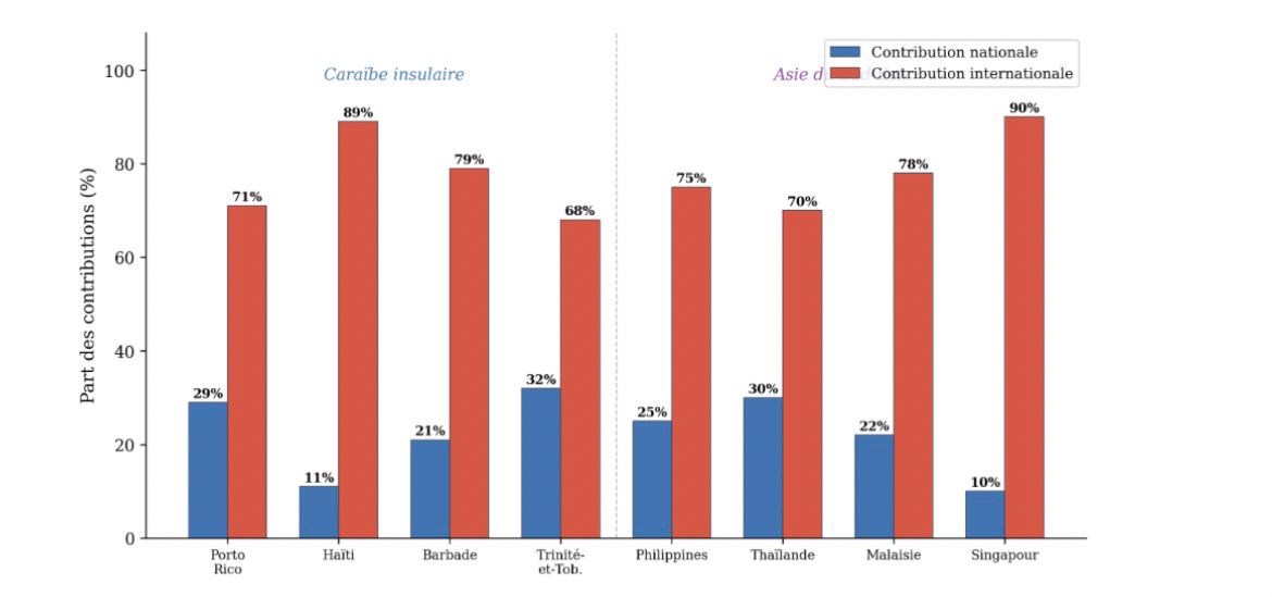 Les deux régions présentent une forte dépendance vis-à-vis des partenaires internationaux. Dans la Caraïbe, les pays extérieurs contribuent à 70 % des publications, contre environ 43 % pour l’Asie du Sud-Est (Figure 6). Haïti affiche la plus faible contribution nationale (11 %) tandis que Trinité-et-Tobago se distingue avec 32 %, portée par l’University of the West Indies. En Asie, les quatre territoires étudiés représentent collectivement 57 % des contributions. Vingt-trois pays partenaires sont impliqués dans le corpus asiatique contre 29 pour la Caraïbe.