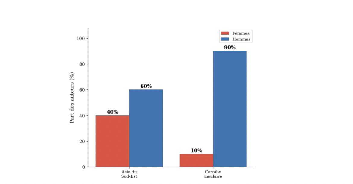 L’analyse de la dimension genre révèle que 40 % des 160 auteurs du corpus asiatique sont des femmes, un taux nettement supérieur à celui observé dans la Caraïbe. Cependant, parmi les 10 auteurs les plus collaboratifs de chaque région, seulement 10 % sont des femmes dans les deux cas (Figure 7). Cette sous-représentation féminine aux positions de leadership scientifique est préoccupante, d’autant que les femmes sont souvent les plus touchées par les impacts du changement climatique (UN Women, 2020).