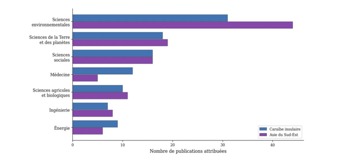 Les sciences environnementales dominent dans les deux régions, avec 31 attributions pour la Caraïbe et 44 pour l’Asie (Figure 4). Les sciences de la Terre et les sciences sociales constituent également des pôles majeurs. Une différence notable apparaît : la médecine est plus représentée dans le corpus caribéen, tandis que les sciences agricoles et l’ingénierie sont relativement plus présentes en Asie. Dans les deux régions, les sciences des matériaux restent quasi absentes (1 à 2 publications), malgré l’importance du secteur du bâtiment dans les émissions de GES (UNEP, 2023).