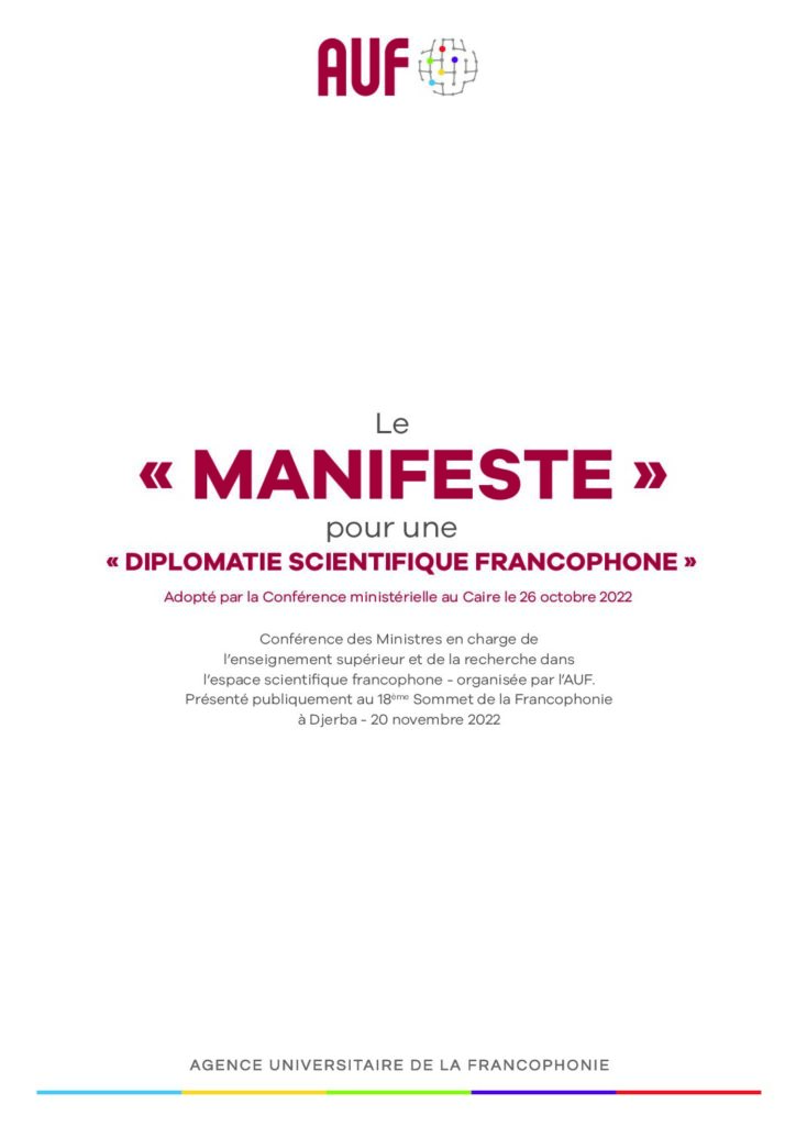 The Manifesto for a Francophone Scientific Diplomacy, adopted on 26 October 2022 at the Ministerial Conference in Cairo (Egypt) and presented at the 18th Summit of La Francophonie in Djerba (Tunisia) on 20 November 2022, represents a major milestone for the Agence universitaire de la Francophonie (AUF). Initiated during the first World Week of the Scientific Francophonie in Bucharest in September 2021, this unpublished document – co-signed or validated in principle by nearly 40 countries (including Haiti) – aims to transform the Francophonie into a space for proactive and supportive scientific cooperation. It responds to the urgency of global challenges (climate, pandemics, inequalities) by placing science at the heart of diplomacy, with AUF as a key operator.