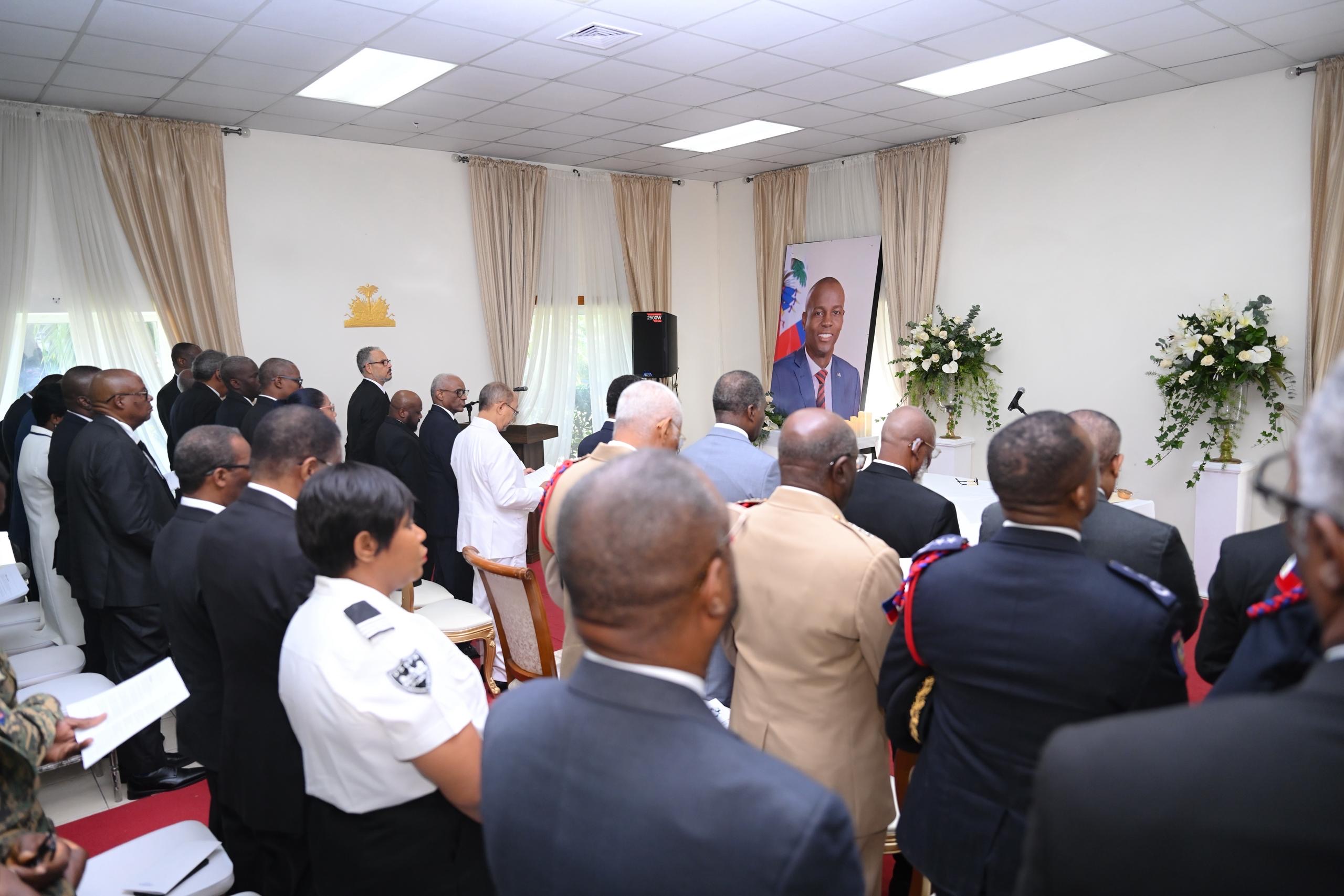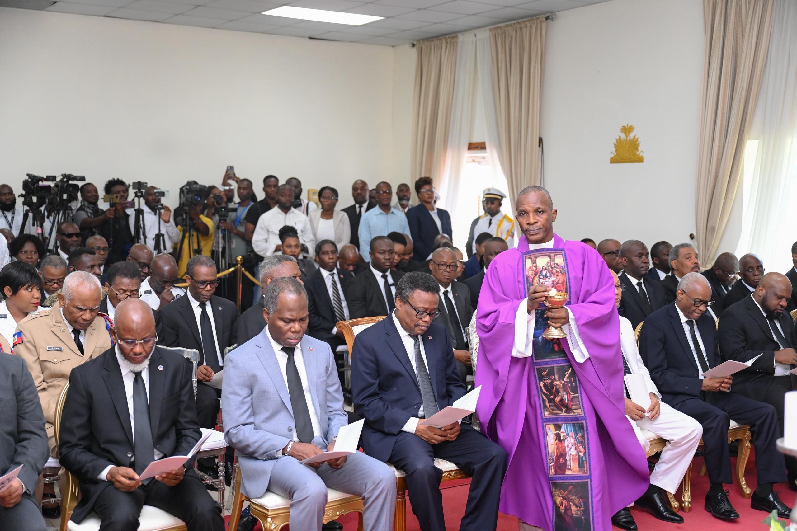 Port-au-Prince, July 7, 2025.- On the occasion of the 4th anniversary of the assassination of President Jovenel Moïse, the Transitional Presidential Council (CPT) held a commemorative mass on Monday, July 7. The CPT took advantage of this symbolic date to express its sympathy to the family of the deceased and the Haitian people, while reaffirming its commitment to work for peace, love and stability in the country.