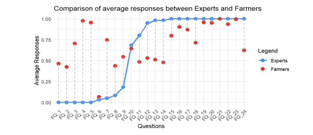 Cette étude vise à analyser l’écart entre la perception locale des ménages agricoles et le discours des experts sur le changement climatique en Haïti et en République dominicaine, deux pays partageant le même territoire. Nous avons posé 24 questions identiques aux experts et aux ménages agricoles, en utilisant les réponses des experts comme référence. L’écart a été quantifié en mesurant la distance moyenne de chaque ménage par rapport à ces références. Le calcul de cet écart s’est déroulé en plusieurs étapes. Premièrement, les variables d’intérêt ont été sélectionnées, les réponses binaires (Oui ou Non) étant converties en 1 et 0. Ensuite, nous avons calculé la réponse moyenne pour chaque ménage agricole, en ajoutant une colonne « FQ moyen ». La troisième étape a consisté à calculer le FQ moyen pour les 60 experts.