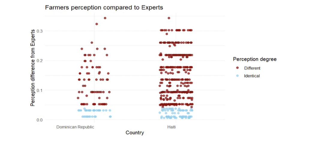 This study quantifies the gap between local perceptions of 550 agricultural households (430 in Haiti and 120 in the Dominican Republic) and the views of 60 climate change experts. This quantification is based on the ancestral knowledge of agricultural households, using meteorological, biological and astrological indicators, and expert opinions based on scientific observations. To measure this gap, we asked 24 identical questions to experts and farm households, using the experts' answers as a reference. These responses, mostly converging, reflect the reality of climate change. We then quantified the average distance of each farm household from these references. Fisher and x2 tests were used to assess this distance. A binary regression model then identified the main factors influencing the perception gap of agricultural households and examined whether this gap is associated with greater socio-economic vulnerability. The results revealed that in Haiti, 70 per cent of agricultural households had a different perception than experts. In the Dominican Republic, this proportion was 47.50%. Vulnerable agricultural households (OR = 12.94, p < 0.001) and very vulnerable (OR = 4.18, p < 0.05) were more likely to have a different perception of climate change than experts.