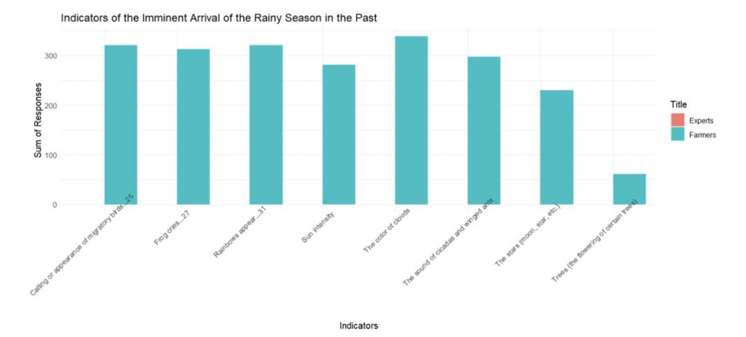 Les résultats de notre étude montrent que les ménages agricoles sont influencés par les régimes pluviométriques saisonniers en observant les changements de la nature. Par exemple, ils observent le développement et l’évolution de certaines plantes et arbres tout au long de l’année. Ils portent notamment une attention particulière aux cultures telles que le manioc (Manihot esculenta), la mangue (Mangifera indica) et l’igname (Dioscorea sp). Les agriculteurs sont également attentifs au comportement de certains animaux. Ils écoutent par exemple le chant d’oiseaux comme le rossignol (Luscinia megarhynchos), le pigeon ramier (Columba palumbus) ou la corneille (Corvus corone). Selon eux, ces signes peuvent indiquer si la pluie arrivera plus tôt, plus tard ou sera plus abondante. Ces observations peuvent s’expliquer par des théories évolutionnistes, telles que la « prédiction environnementale », selon lesquelles les plantes et les animaux adaptent leur reproduction aux conditions climatiques (Sakai 2002 ; Williamson et Ickes 2002 ; Dunn et al. 2011 ; Maren et al. 2019). Ce résultat est cohérent avec les études d’Acharya (2011) ; Shoko et Shoko (2013) ; Kolawole et al. (2014) ; Elia et al. (2014) ; Roco et al. (2015) ; Jiri et al. (2016) ; Tume et al. (2019) ; Radeny et al. (2019) ; Mulubrhan et al. (2019) ; Ankrah et al. (2022) ; Balasha et al. (2023) ; Ankrah et al. (2023), soulignant que les ménages agricoles ruraux utilisent les connaissances locales pour prévoir le climat et la météo.