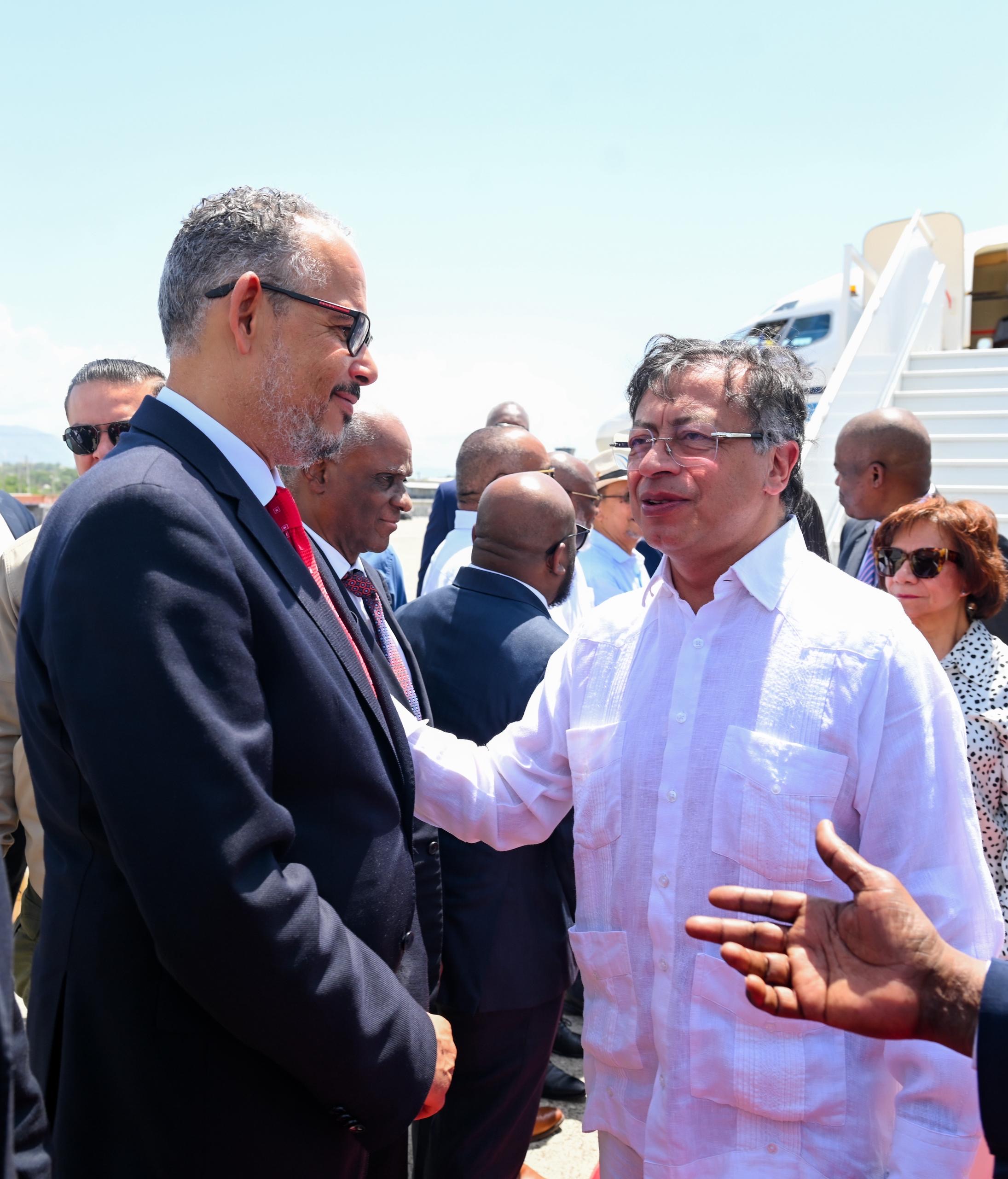 Port-au-Prince, le 18 juillet 2025.- Le Président du Conseil Présidentiel de Transition (CPT), Monsieur Fritz Alphonse Jean, accompagné du Premier ministre, Monsieur Alix Didier Fils-Aimé, et des membres du gouvernement, a accueilli à l’aéroport international Toussaint Louverture une délégation colombienne conduite par le président Gustavo Petro, en visite officielle en Haïti pour la deuxième fois cette année. Cette visite vise à renforcer les relations bilatérales entre Haïti et la Colombie.