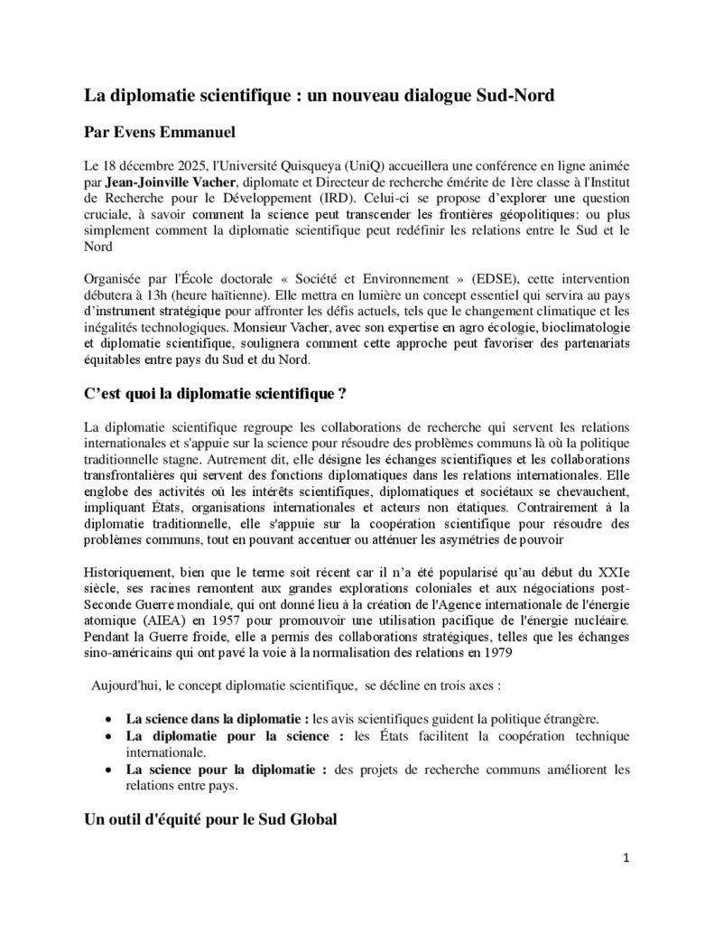 Le 18 décembre 2025, l’Université Quisqueya (UniQ) accueillera une conférence en ligne animée par Jean-Joinville Vacher, diplomate et Directeur de recherche émérite de 1ère classe à l’Institut de Recherche pour le Développement (IRD). Celui-ci se propose d’explorer une question cruciale, à savoir comment la science peut transcender les frontières géopolitiques: ou plus simplement comment la diplomatie scientifique peut redéfinir les relations entre le Sud et le Nord.