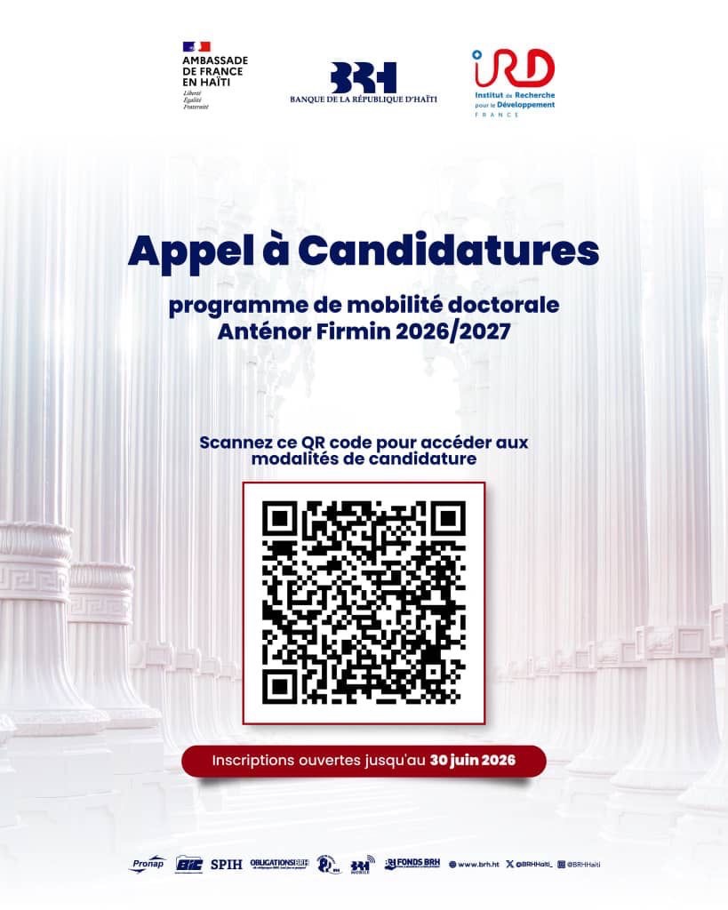 Port-au-Prince, le 31 mars 2026.- L’Ambassade de France en Haïti, la Banque de la République d’Haïti (BRH) et l’Institut de Recherche pour le Développement (IRD) lancent, ce 31 mars 2026, l’appel à candidatures pour la 6e édition du programme de mobilité doctorale Anténor Firmin. Destiné aux doctorants haïtiens, ce dispositif soutient la formation à la recherche à travers des séjours internationaux financés, avec une date limite fixée au 30 juin 2026.